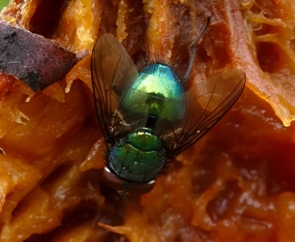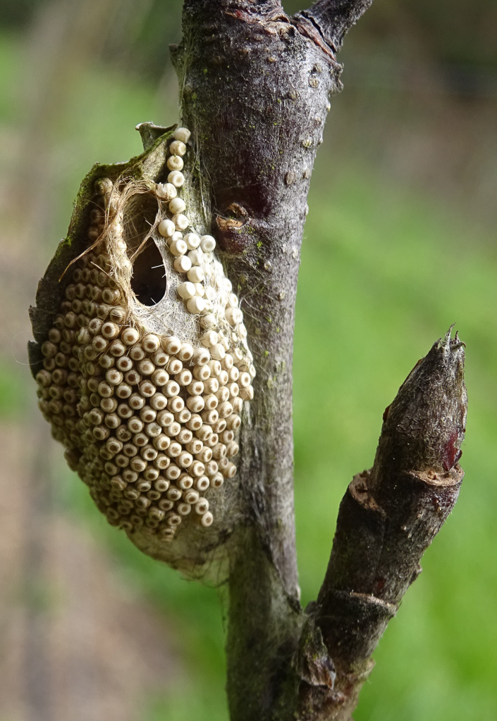 Uma observação ainda do início de Março: uma aranha Agalenatea redii repousa num ramo de macieiraNuma maçã podre que se conservou na árvore alimenta-se uma mosca Lucilia sericataNo chão de uma entrelinha do pomar deambula um Bombus muscorum, um abelhão solitário muito menos frequente que o mais conhecido Bombus terrestrisNum ramo de macieira foi deixada esta postura, provavelmente de um lepidóptero.Árvores revestidas com argila de caulino