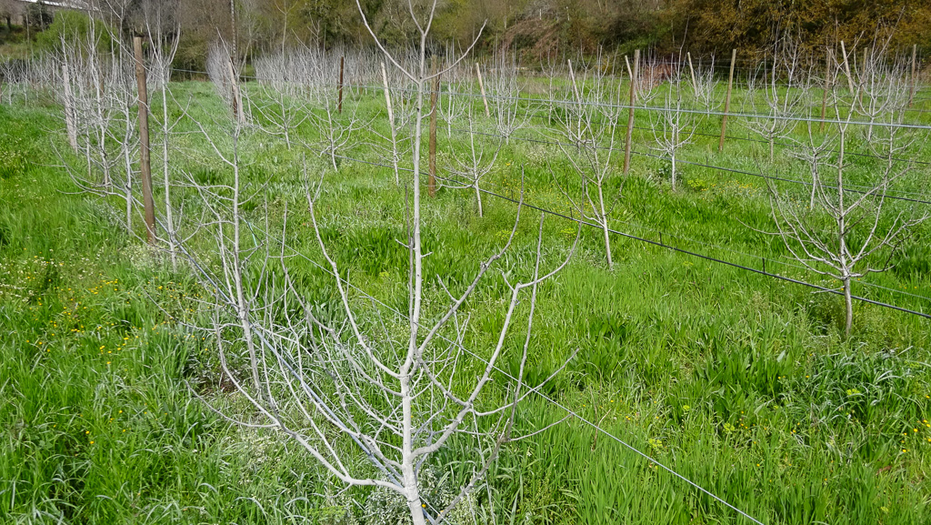 Em Março, os trabalhos de Inverno aceleraram para o seu final: a poda, o grande trabalho do Inverno, programado em Dezembro para terminar no final de Março, foi efectivamente terminado no dia 1 de Abril (e não é mentira!). Mas houve outros trabalhos importantes em Março: enxertias, retanchas, e a continuação da aplicação das caldas de Inverno: a calda cúprica para prevenção do cancro dos ramos e a calda de argila de caulino, para protecção geral das árvores. Esta deixa-as revestidas de branco, uma roupagem bastante elegante para receber a Primavera!