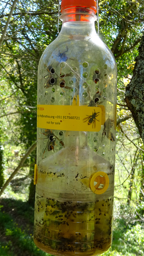 As vespas asiáticas “comparecem” em grande número nas armadilhas colocadas para as capturar. Esta armadilha, distribuída pela Associação “A Nativa” é a mais selectiva das armadilhas existentes para capturar vespas asiáticas.