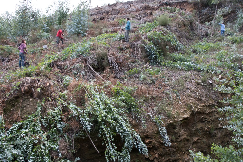 Na prática, quer devido ao declive, quer devido à presença de plantas com interesse, a maior parte do trabalho de restauro realiza-se sem mobilização do solo por maquinaria pesada. A remoção de exóticas e invasoras pode ser simultânea à plantação, sementeira ou recuperação de plantas já existentes, embora isso levante sempre problemas de gestão, pois o seu crescimento é sempre mais rápido que do que o das autóctones. Por outro lado, uma tentativa de remoção definitiva inicial, ainda que sempre parcial, pode não ser possível sem a aplicação de herbicida, ou, mais uma vez, sem a presença constante de um esforço de contenção. Acresce o facto de, em condições de ausência de mobilização do solo por meio de maquinaria, a plantação de árvores ser mais difícil e exigente, e de estas terem um crescimento mais lento. Por isso, mesmo quando já não há exóticas, a gestão da própria vegetação espontânea autóctone pode ser um desafio.