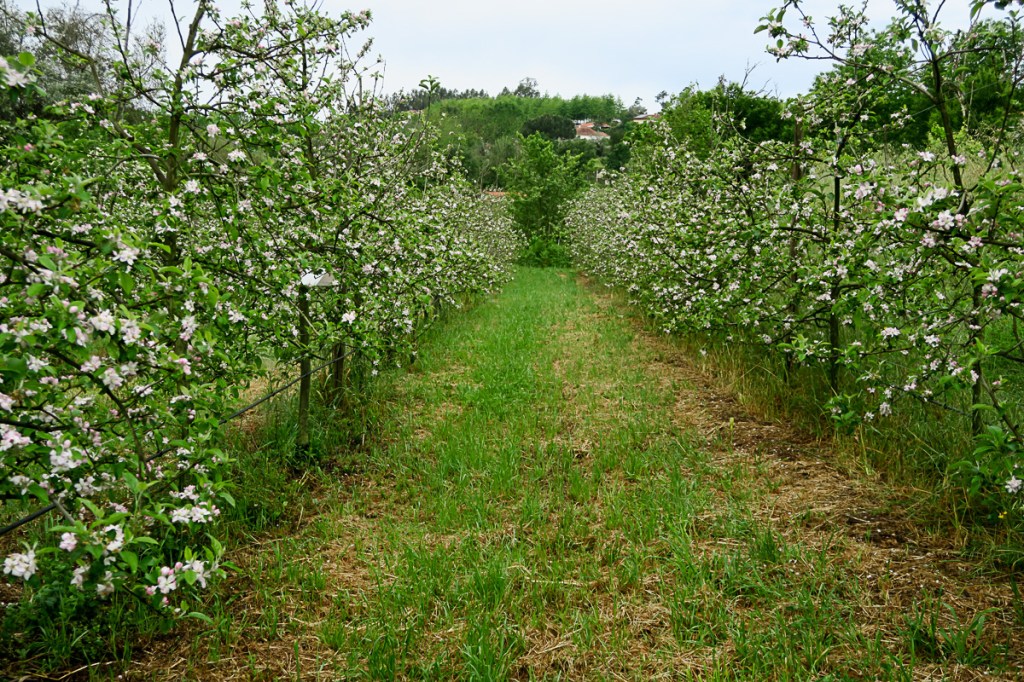 Manutenção de cobertura verde na entre-linha dos pomares, com promoção de espécies favoráveis (azevém, trevos).